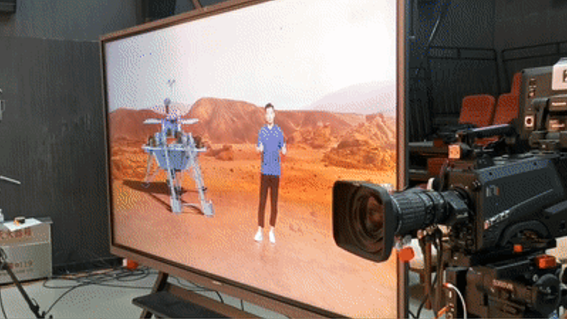 德火DRS系统为拍摄提供“场景高匹配“,达到实时合成,毫无压力。前景虚拟植入画面基于云台跟踪,拍摄方式通过前后景画面的无缝匹配,使得主持人仿佛置身于火星表面,在演播室实时呈现虚实结合,“所见即所得”。